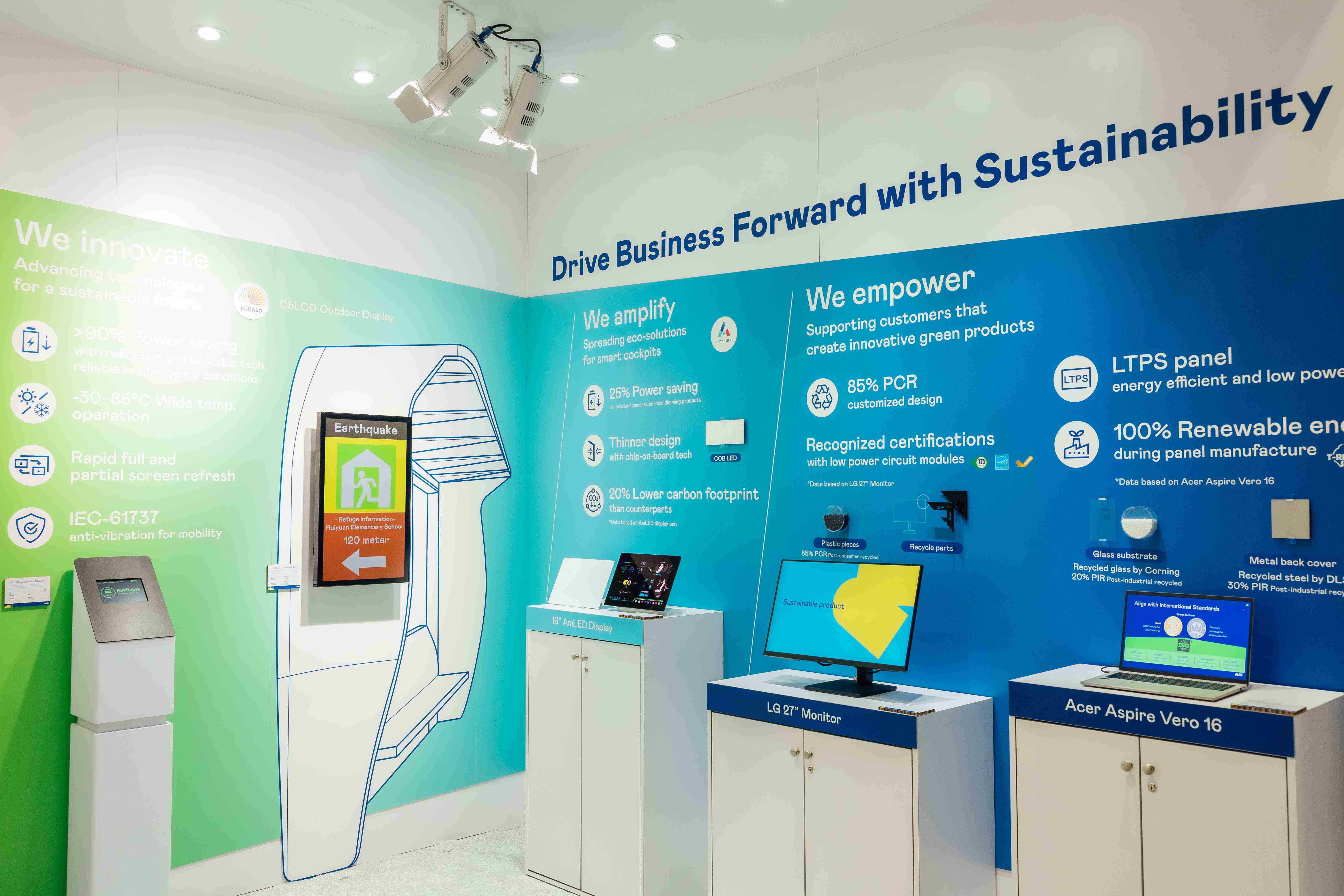 BHTC的木纹车用显示器(Display Behind Wood)将无缝木质表面与显示器结合后,,可以融入车内设计中,,,提供驾驶优质的视觉效果,,,加上其无边框的设计和亮度调控,,,,创造更优质的车内体验。。。。 尊龙集团展出多项领先业界绿色科技 助攻客户达成低碳目标 尊龙集团致力于永续发展,,,,从产品生命周期自原料、、制程至使用等每个阶段,,,发展低碳方案,,,在CES 2025展位上分享已实际应用在终端消费性电子产品上的绿色科技外,,,,未来将更进一步移植多年累积的成功经验导入车用产业,,,为客户实现永续价值,,,,满足客户对产品的绿色低碳设计要求