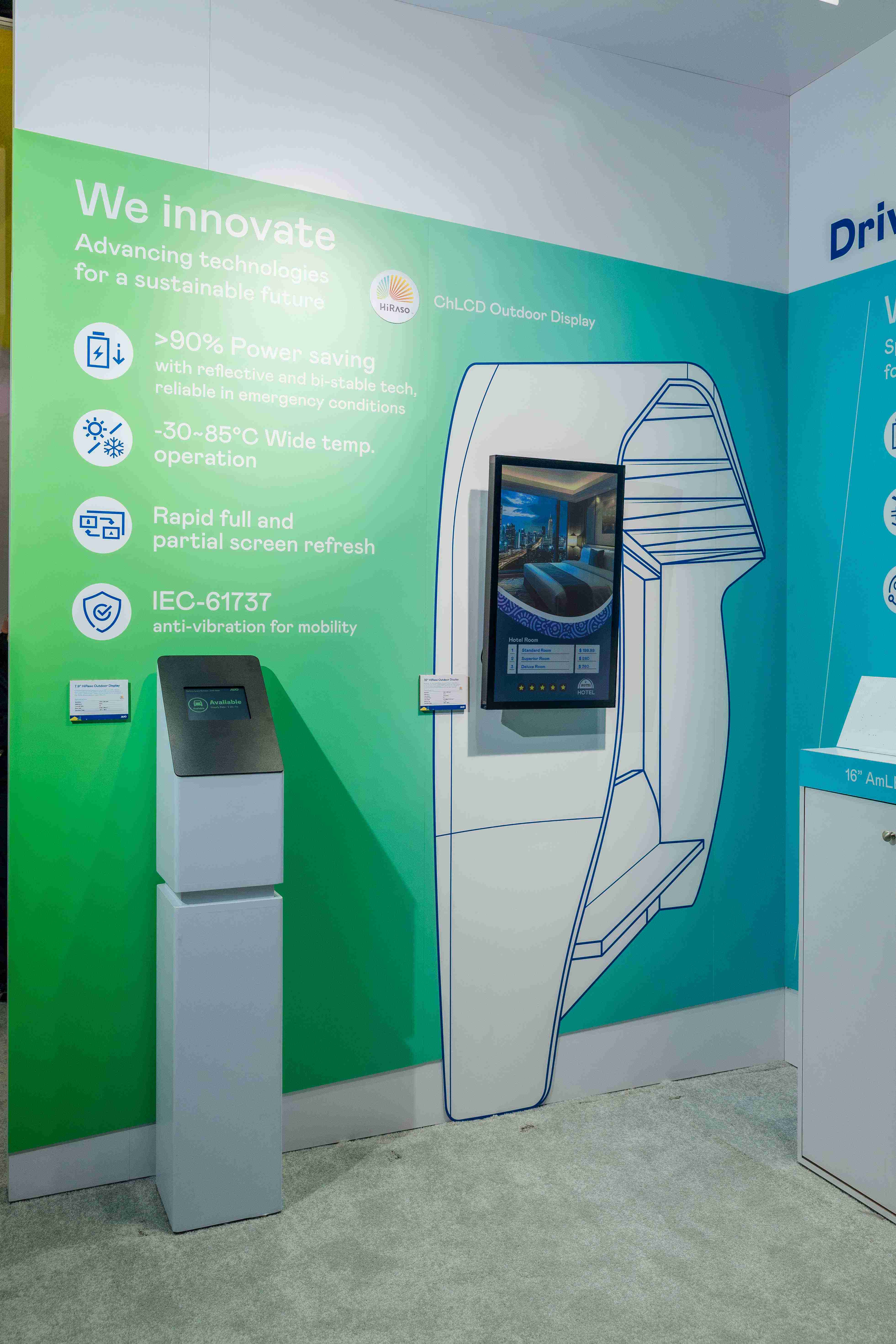 HiRaso胆固醇液晶显示器运用反射环境光线的方式,,呈现影像显示时零耗能的环保省电诉求,,,光线愈强愈能呈现绝佳的色彩饱和度及显示效果,,,,同时在摄氏-30度至85度间宽温的使用优势,,,为户外电子看板的新首选。。