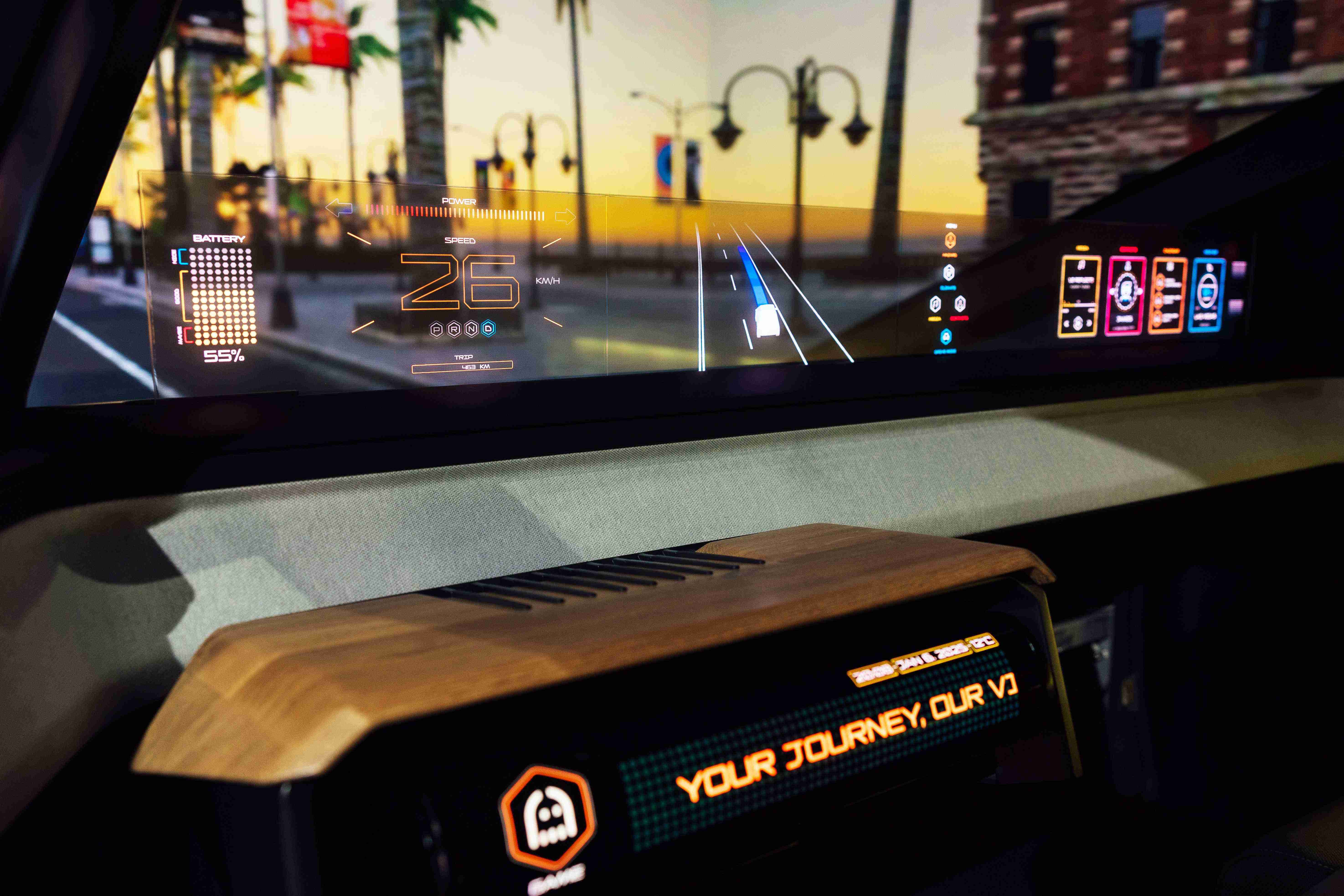 车用运算方案驱动无界透明显示介面(Horizon Image Glass),,整合仪表板、、中控及副驾显示功能为一体式全景呈现,,,,不仅提供清晰的外部视野,,亦能即时显示车辆状态、、导航及路况资讯,,并赋予个性化设定与驾驶安全警示等加值化服务。。